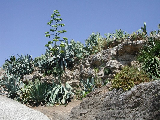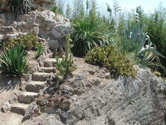 The Rocky ridge is a steep wall made of travertine and red tuff, delimiting the southern flat area of the Desert. The site shows microclimatic and pedological characteristics that differ from the surrounding areas due to factors such as its south-facing position, its shelter from cold winds, and its poor water stagnation. This is the hottest area of the Botanical Garden, housing species of small size such as small globular cactus, located in natural cavities or manually dug into the rock. Over the years these species, perfectly acclimatized, have made precious the already impressive rocky wall. Many of these species not only survive the harsh winter, but they grow very rapidly, resulting in "tree-like" and "monumental" habitus