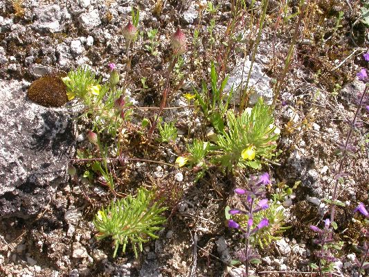 Numerous spontaneous herbaceous species grow on the natural travertine outcrops and spread throughout the garden like the ancient channels and the rocky ridge; these are xerophilous species, whose presence is linked to the arid conditions of the substrate. Among them we find some rare and highly local species, such as Ajuga chamaepitys (L.) Schreb., Allium chamaemoly L., Asphodeline lutea L. Rchb., some orchids such as Ophrys sphegodes Mill. subsp. passionis (Sennen) Sanz & Nuet, and the spontaneous hybrid Ophrys x grottaliensis P. Delforge & C. Delforge.
