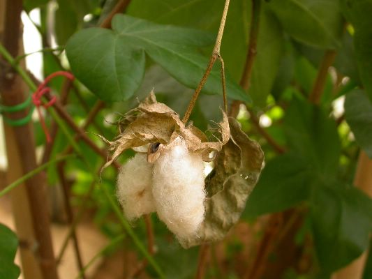 Pianta originaria dell’India da cui si ricava il cotone. La fibra si forma all'interno della capsula che a maturità si apre in 4 parti mostrando il batuffolo di cotone.Â