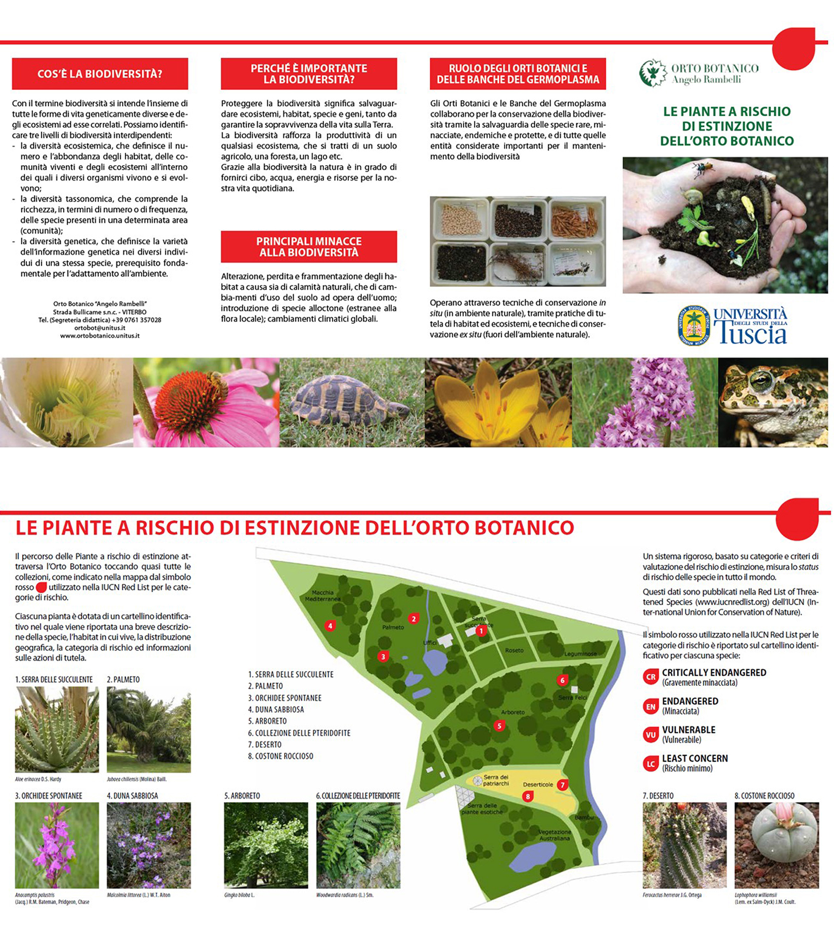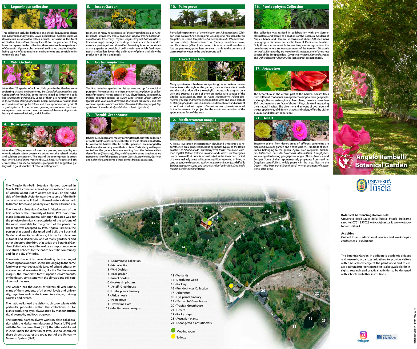 The Botanical Garden ‘Angelo Rambelli’ of the University of Tuscia is an institution created to support teaching, research, educational and recreational facilities. In addition to the ex-situ/in situ conservation of plants’ species obtained through the care of the collections, the Botanic Garden has a key role in the diffusion of scientific knowledge; it promotes courses, events and exhibitions to provide the public with basic information on the plant’s world, thus creating a naturalistic consciousness. The area is divided into parcels hosting plants, arranged according to either taxonomic or phytogeographic criteria, or environmental reconstructions, consistent with the climatic and soil conditions of the area.