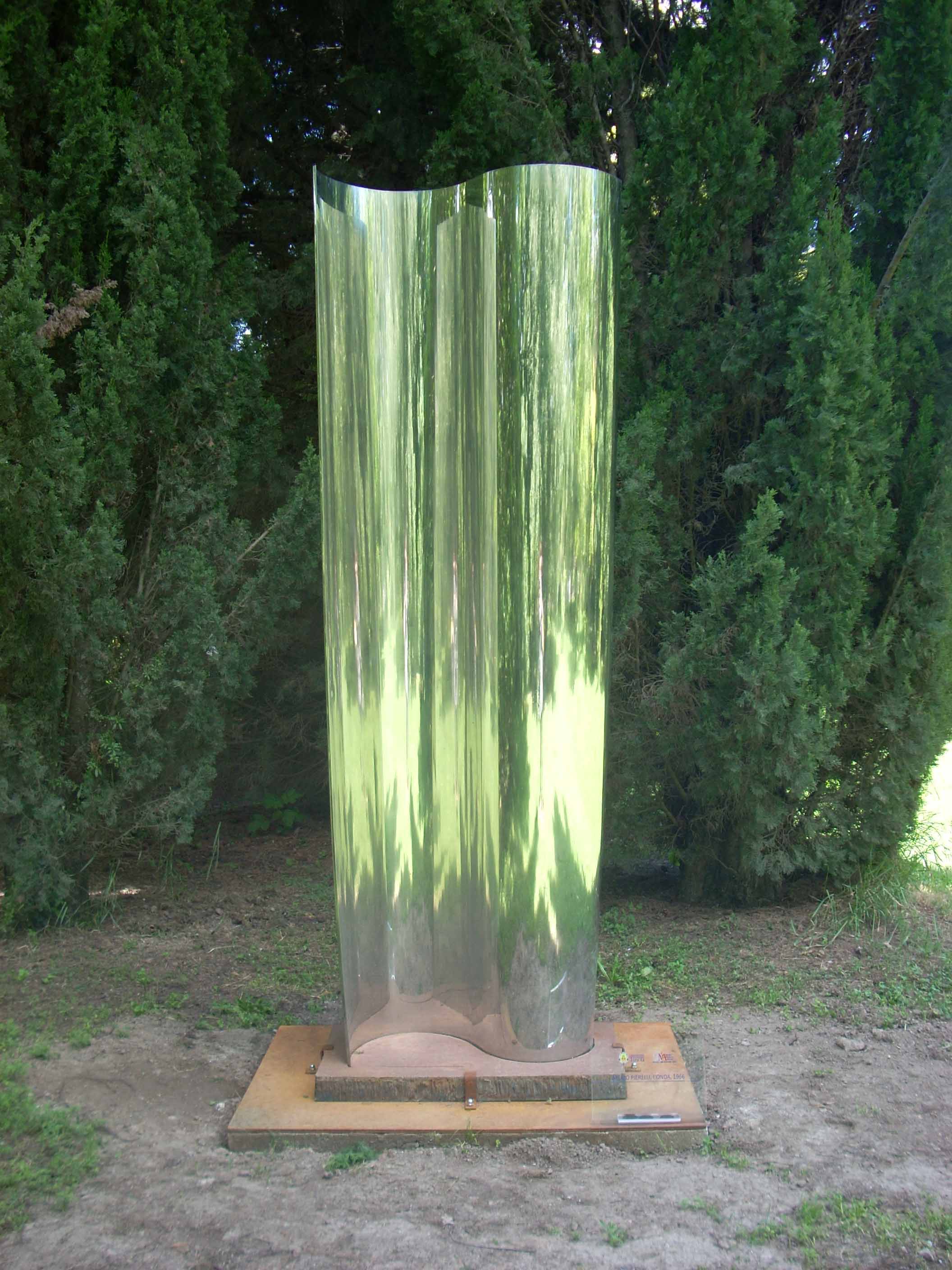 L’onda (1966), opera dell’artista marchigiano Attilio Pierelli, proveniente dal suo Museo di sculture iperspaziali a Bomarzo, è qui per espresso desiderio dell’artista (scomparso nel 2013) dal 2012. Nata per stare all’aperto, la scultura in acciaio inox finemente lucidato, è costituita da fogli di lamine specchianti variamente piegate a formare superfici ondulate da cui si genera un campo di riflessi deformanti in continua mutazione, a seconda dei punti di vista e delle condizioni ambientali, che coinvolgono lo spettatore restituendolo ad uno spazio dell’immagine, irreale, estetico.